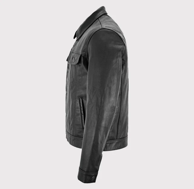 This Classic Black Trucker Western Leather Jacket combines the rough western look with the fitted look of an old school trucker. Its smooth black leather and large detail of a yoke create a masculine rugged style that cannot be overlooked anywhere. Not only does this jacket look cool on the open road, this jacket can even make hitting the town cool.